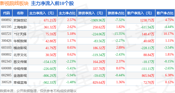 从资金流向上来看,当日影视院线板块主力资金净流出2.15亿元,游资资金净流出1185.93万元,散户资金净流入2.27亿元。影视院线板块个股资金流向见下表: