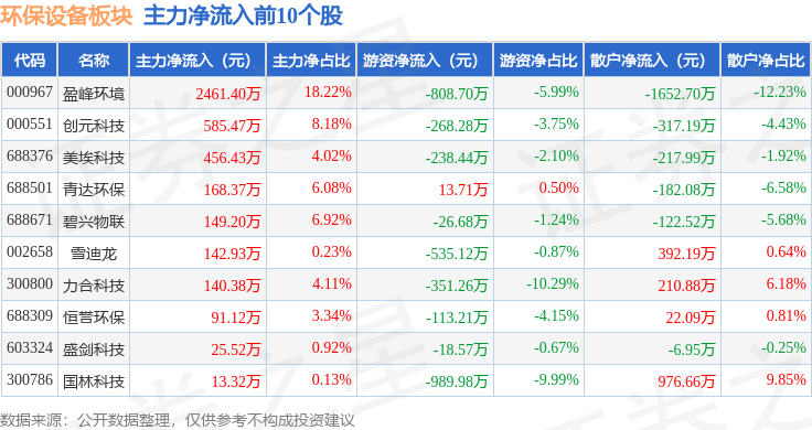从资金流向上来看,当日环保设备板块主力资金净流出1.28亿元,游资资金净流出510.56万元,散户资金净流入1.33亿元。环保设备板块个股资金流向见下表: