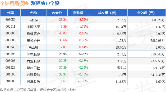 证券之星消息,11月13日个护用品板块较上一交易日上涨0.33%,倍加洁领涨。当日上证指数报收于4029.5,上涨0.73%。深证成指报收于13476.52,上涨1.78%。个护用品板块个股涨跌见下表: