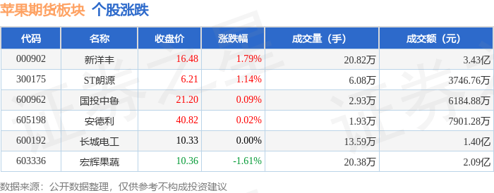 证券之星消息,11月13日苹果期货板块较上一交易日上涨0.55%,新洋丰领涨。当日上证指数报收于4029.5,上涨0.73%。深证成指报收于13476.52,上涨1.78%。苹果期货板块个股涨跌见下表: