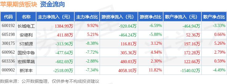 从资金流向上来看,当日苹果期货板块主力资金净流出2115.52万元,游资资金净流入3576.02万元,散户资金净流出1460.5万元。苹果期货板块个股资金流向见下表: