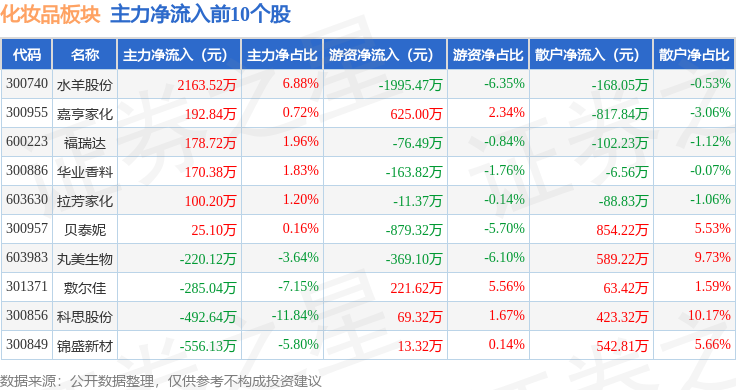 从资金流向上来看,当日化妆品板块主力资金净流出5656.82万元,游资资金净流出3210.57万元,散户资金净流入8867.39万元。化妆品板块个股资金流向见下表:
