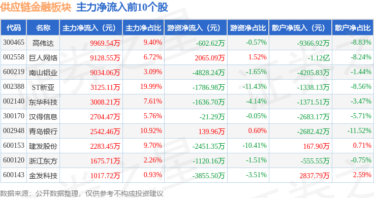 从资金流向上来看,当日供应链金融板块主力资金净流出1.51亿元,游资资金净流入4487.09万元,散户资金净流入1.07亿元。供应链金融板块个股资金流向见下表: