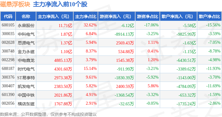 从资金流向上来看,当日磁悬浮板块主力资金净流入14.1亿元,游资资金净流出6.35亿元,散户资金净流出7.75亿元。磁悬浮板块个股资金流向见下表: