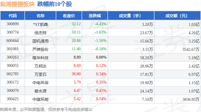 证券之星消息,11月13日盐湖提锂板块较上一交易日上涨5.06%,星源材质领涨。当日上证指数报收于4029.5,上涨0.73%。深证成指报收于13476.52,上涨1.78%。盐湖提锂板块个股涨跌见下表: