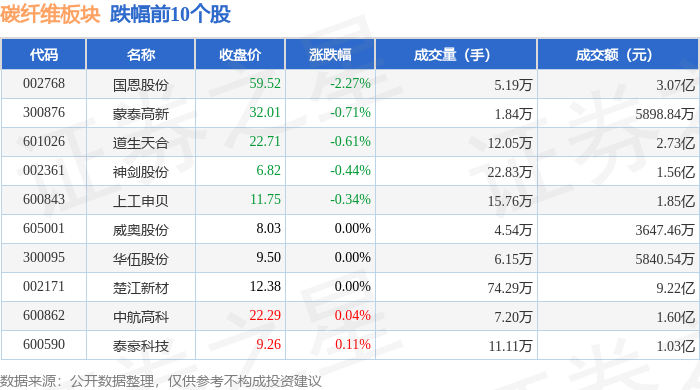 证券之星消息,11月13日碳纤维板块较上一交易日上涨2.03%,中材科技领涨。当日上证指数报收于4029.5,上涨0.73%。深证成指报收于13476.52,上涨1.78%。碳纤维板块个股涨跌见下表: