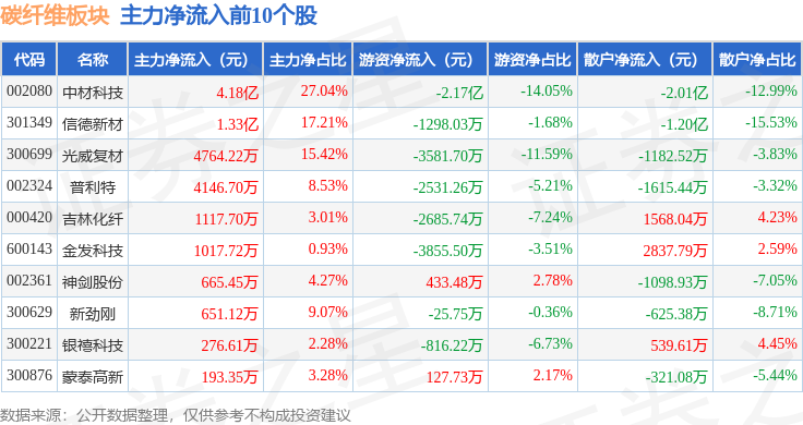 从资金流向上来看,当日碳纤维板块主力资金净流入4.04亿元,游资资金净流出3.39亿元,散户资金净流出6552.21万元。碳纤维板块个股资金流向见下表:
