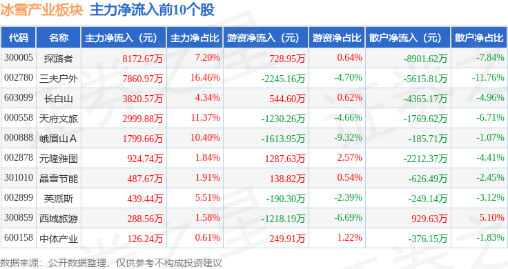 从资金流向上来看,当日冰雪产业板块主力资金净流入4461.97万元,游资资金净流入3608.53万元,散户资金净流出8070.5万元。冰雪产业板块个股资金流向见下表: