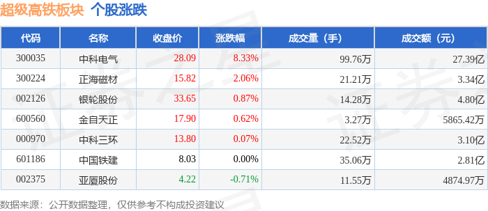 证券之星消息,11月13日超级高铁板块较上一交易日上涨1.02%,中科电气领涨。当日上证指数报收于4029.5,上涨0.73%。深证成指报收于13476.52,上涨1.78%。超级高铁板块个股涨跌见下表: