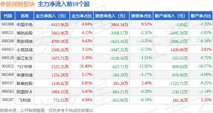从资金流向上来看,当日参股保险板块主力资金净流出1.17亿元,游资资金净流出3827.74万元,散户资金净流入1.55亿元。参股保险板块个股资金流向见下表: