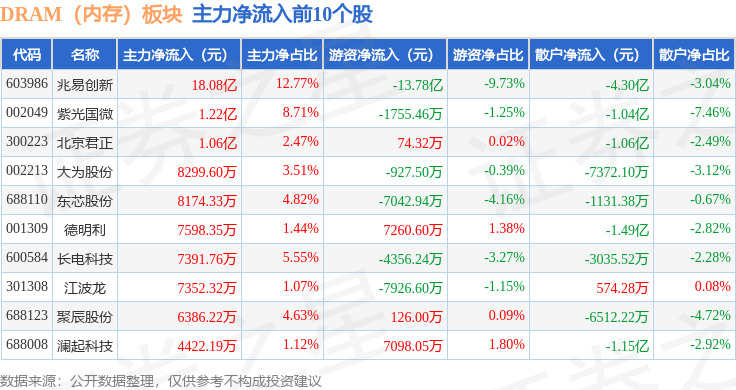 从资金流向上来看,当日DRAM(内存)板块主力资金净流入7.5亿元,游资资金净流出13.34亿元,散户资金净流入5.84亿元。DRAM(内存)板块个股资金流向见下表: