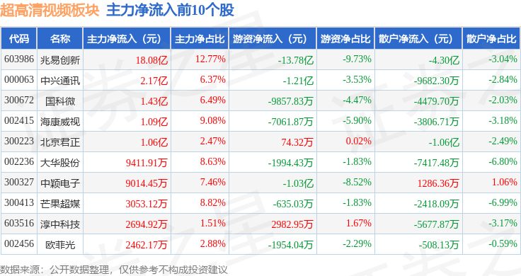 从资金流向上来看,当日超高清视频板块主力资金净流入17.7亿元,游资资金净流出16.18亿元,散户资金净流出1.52亿元。超高清视频板块个股资金流向见下表:
