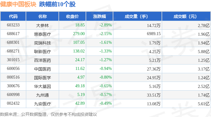 从资金流向上来看,当日健康中国板块主力资金净流入6.66亿元,游资资金净流出3.93亿元,散户资金净流出2.73亿元。健康中国板块个股资金流向见下表: