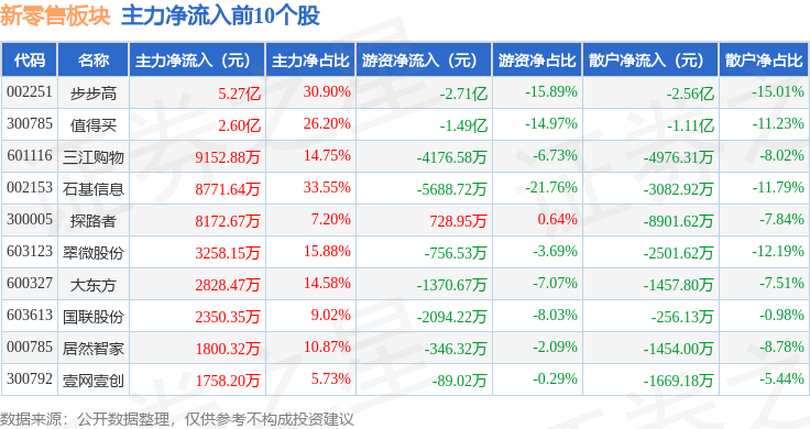 从资金流向上来看,当日新零售板块主力资金净流入4.54亿元,游资资金净流出6.63亿元,散户资金净流入2.08亿元。新零售板块个股资金流向见下表: