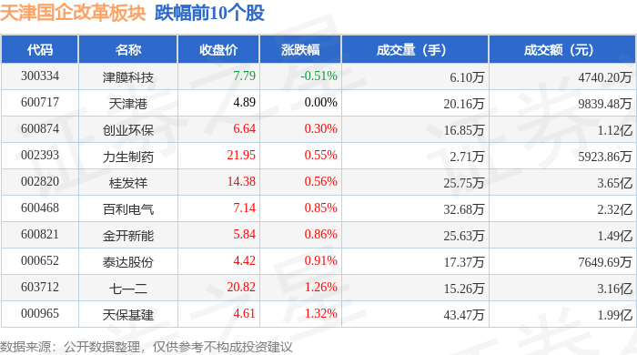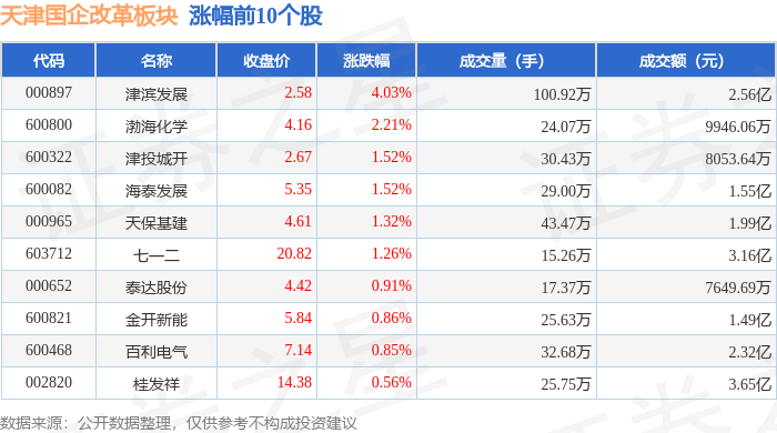 证券之星消息,11月13日天津国企改革板块较上一交易日上涨0.96%,津滨发展领涨。当日上证指数报收于4029.5,上涨0.73%。深证成指报收于13476.52,上涨1.78%。天津国企改革板块个股涨跌见下表: