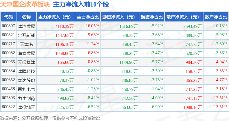 从资金流向上来看,当日天津国企改革板块主力资金净流入1083.72万元,游资资金净流出6501.25万元,散户资金净流入5417.53万元。天津国企改革板块个股资金流向见下表:
