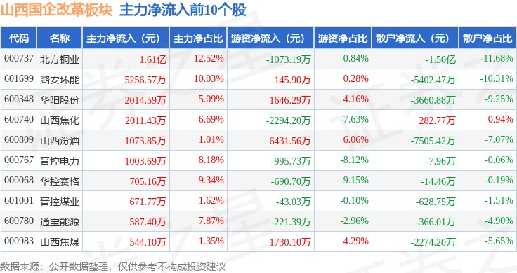 从资金流向上来看,当日山西国企改革板块主力资金净流入2.25亿元,游资资金净流入4151.24万元,散户资金净流出2.66亿元。山西国企改革板块个股资金流向见下表: