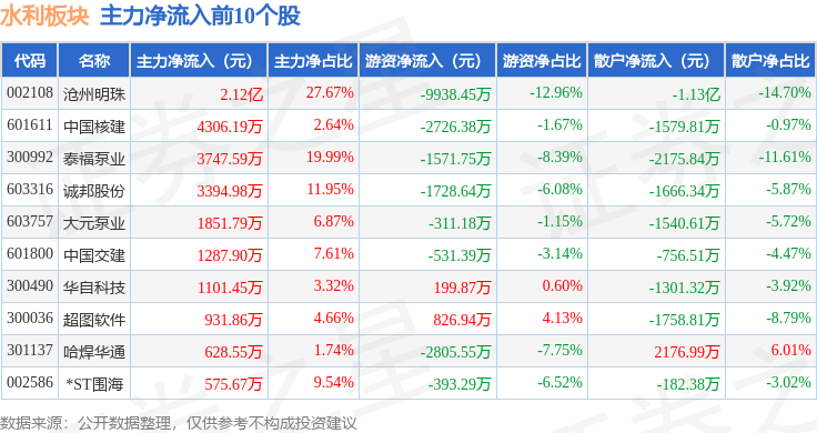 从资金流向上来看,当日水利板块主力资金净流出1214.89万元,游资资金净流出2.4亿元,散户资金净流入2.53亿元。水利板块个股资金流向见下表: