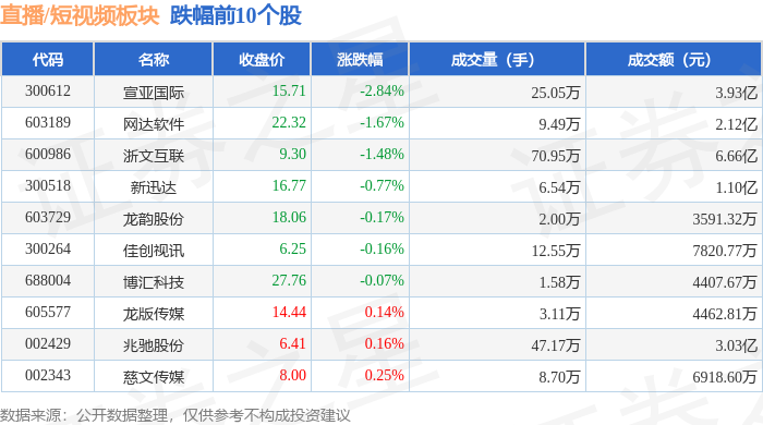 从资金流向上来看,当日直播/短视频板块主力资金净流出2.12亿元,游资资金净流入1.09亿元,散户资金净流入1.04亿元。直播/短视频板块个股资金流向见下表: