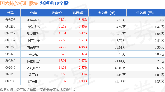 证券之星消息,11月13日国六排放标准板块较上一交易日上涨0.58%,龙蟠科技领涨。当日上证指数报收于4029.5,上涨0.73%。深证成指报收于13476.52,上涨1.78%。国六排放标准板块个股涨跌见下表: