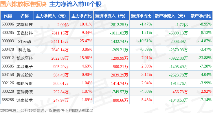 从资金流向上来看,当日国六排放标准板块主力资金净流出7.46亿元,游资资金净流入3.27亿元,散户资金净流入4.19亿元。国六排放标准板块个股资金流向见下表: