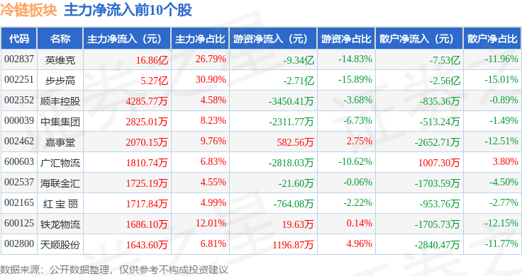 从资金流向上来看,当日冷链板块主力资金净流入16.01亿元,游资资金净流出13.02亿元,散户资金净流出3.0亿元。冷链板块个股资金流向见下表:
