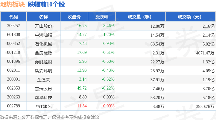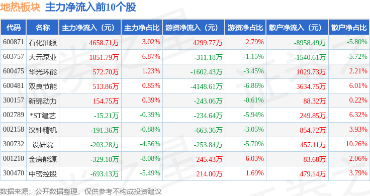 从资金流向上来看,当日地热板块主力资金净流出2.07亿元,游资资金净流入5270.94万元,散户资金净流入1.54亿元。地热板块个股资金流向见下表: