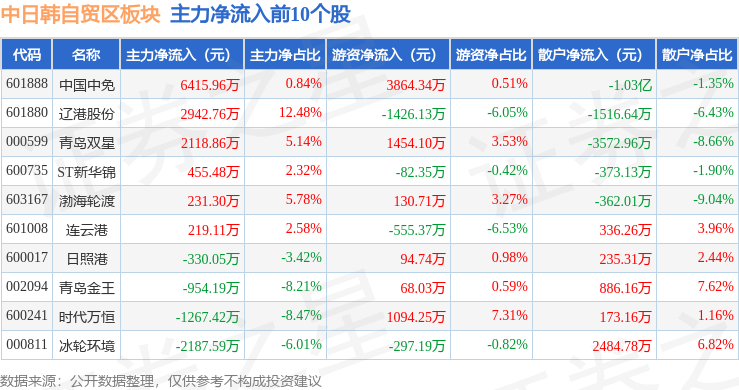从资金流向上来看,当日中日韩自贸区板块主力资金净流入2569.96万元,游资资金净流入3857.19万元,散户资金净流出6427.14万元。中日韩自贸区板块个股资金流向见下表: