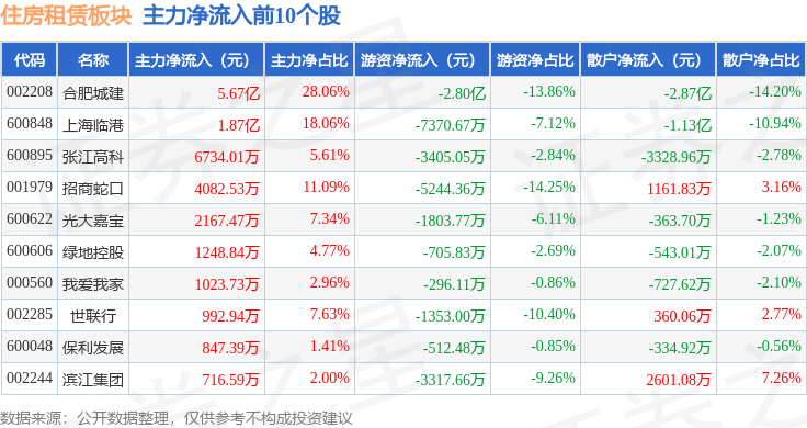 从资金流向上来看,当日住房租赁板块主力资金净流入6.82亿元,游资资金净流出4.56亿元,散户资金净流出2.27亿元。住房租赁板块个股资金流向见下表: