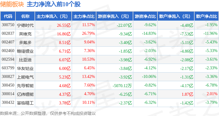 从资金流向上来看,当日储能板块主力资金净流入125.98亿元,游资资金净流出83.72亿元,散户资金净流出42.25亿元。储能板块个股资金流向见下表: