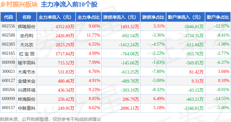 从资金流向上来看,当日乡村振兴板块主力资金净流出5.83亿元,游资资金净流入2.1亿元,散户资金净流入3.73亿元。乡村振兴板块个股资金流向见下表: