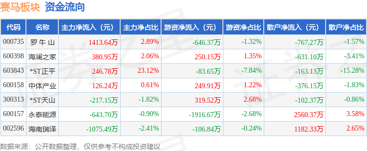 从资金流向上来看,当日赛马板块主力资金净流入231.28万元,游资资金净流出1933.95万元,散户资金净流入1702.67万元。赛马板块个股资金流向见下表: