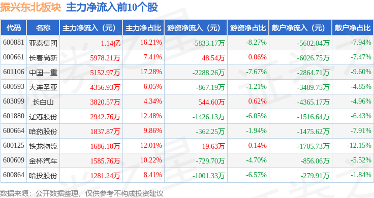从资金流向上来看,当日振兴东北板块主力资金净流出2.95亿元,游资资金净流入1.2亿元,散户资金净流入1.75亿元。振兴东北板块个股资金流向见下表: