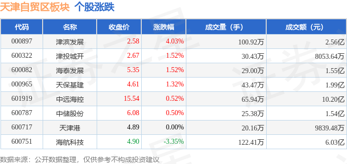 证券之星消息,11月13日天津自贸区板块较上一交易日上涨0.38%,津滨发展领涨。当日上证指数报收于4029.5,上涨0.73%。深证成指报收于13476.52,上涨1.78%。天津自贸区板块个股涨跌见下表: