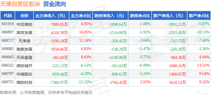 从资金流向上来看,当日天津自贸区板块主力资金净流入4961.14万元,游资资金净流出4267.35万元,散户资金净流出693.78万元。天津自贸区板块个股资金流向见下表: