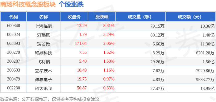 证券之星消息,11月13日商汤科技概念股板块较上一交易日上涨2.32%,上海临港领涨。当日上证指数报收于4029.5,上涨0.73%。深证成指报收于13476.52,上涨1.78%。商汤科技概念股板块个股涨跌见下表: