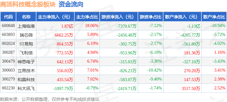 从资金流向上来看,当日商汤科技概念股板块主力资金净流入2.75亿元,游资资金净流出1.52亿元,散户资金净流出1.23亿元。商汤科技概念股板块个股资金流向见下表:
