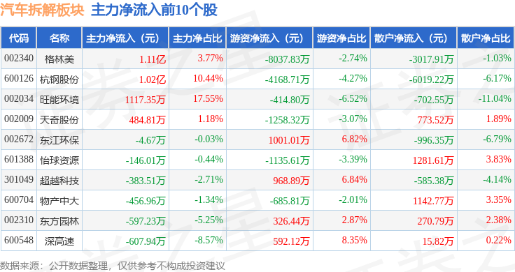 从资金流向上来看,当日汽车拆解板块主力资金净流入1.57亿元,游资资金净流出1.08亿元,散户资金净流出4908.15万元。汽车拆解板块个股资金流向见下表: