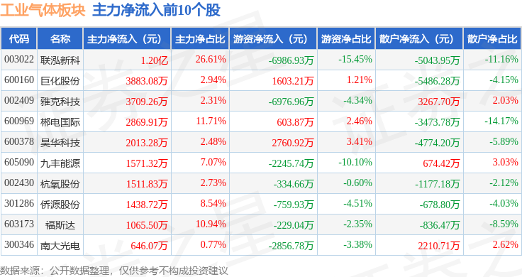 从资金流向上来看,当日工业气体板块主力资金净流入1.06亿元,游资资金净流出2.06亿元,散户资金净流入9965.98万元。工业气体板块个股资金流向见下表: