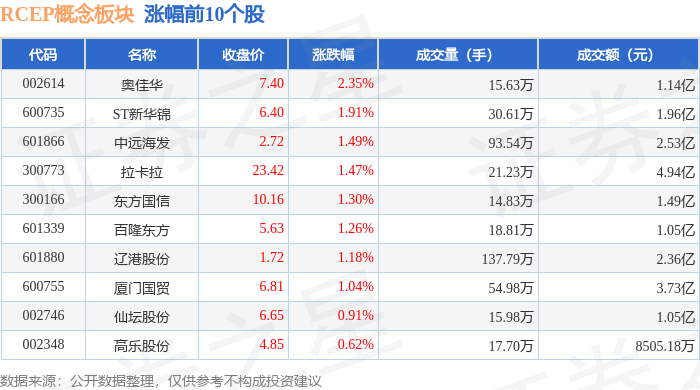 证券之星消息,11月13日RCEP概念板块较上一交易日上涨0.95%,奥佳华领涨。当日上证指数报收于4029.5,上涨0.73%。深证成指报收于13476.52,上涨1.78%。RCEP概念板块个股涨跌见下表: