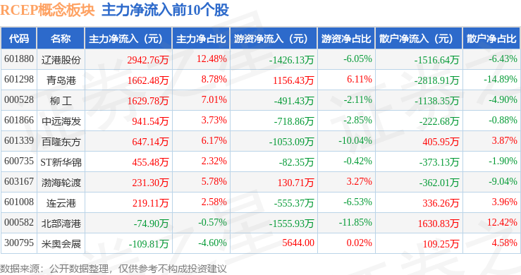 从资金流向上来看,当日RCEP概念板块主力资金净流出4271.34万元,游资资金净流出4021.17万元,散户资金净流入8292.52万元。RCEP概念板块个股资金流向见下表: