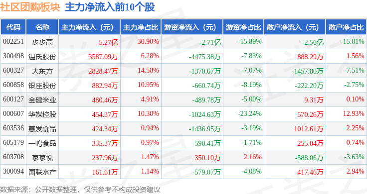 从资金流向上来看,当日社区团购板块主力资金净流入3.51亿元,游资资金净流出4.08亿元,散户资金净流入5662.5万元。社区团购板块个股资金流向见下表: