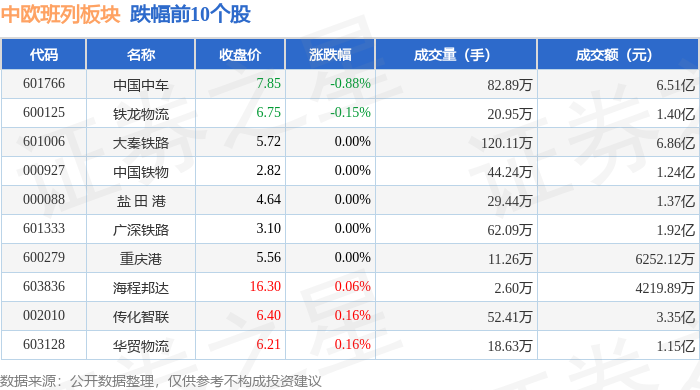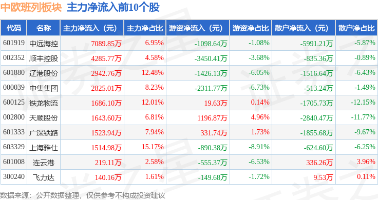 从资金流向上来看,当日中欧班列板块主力资金净流入2350.6万元,游资资金净流出2610.12万元,散户资金净流入259.52万元。中欧班列板块个股资金流向见下表: