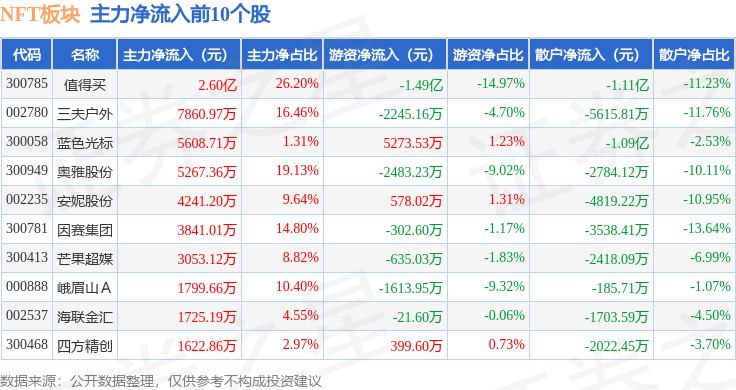 从资金流向上来看,当日NFT板块主力资金净流出5.83亿元,游资资金净流入1.99亿元,散户资金净流入3.84亿元。NFT板块个股资金流向见下表: