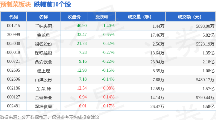 证券之星消息,11月13日预制菜板块较上一交易日上涨1.26%,海欣食品领涨。当日上证指数报收于4029.5,上涨0.73%。深证成指报收于13476.52,上涨1.78%。预制菜板块个股涨跌见下表: