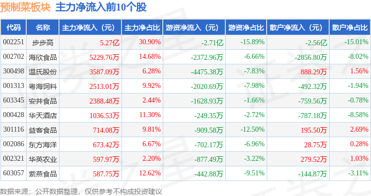 从资金流向上来看,当日预制菜板块主力资金净流入9333.07万元,游资资金净流出3.52亿元,散户资金净流入2.59亿元。预制菜板块个股资金流向见下表: