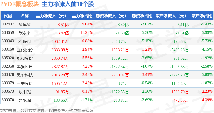 从资金流向上来看,当日PVDF概念板块主力资金净流入13.27亿元,游资资金净流出5.53亿元,散户资金净流出7.74亿元。PVDF概念板块个股资金流向见下表: