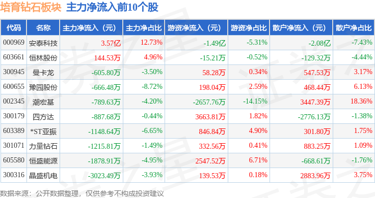 从资金流向上来看,当日培育钻石板块主力资金净流入3145.14万元,游资资金净流出9400.16万元,散户资金净流入6255.03万元。培育钻石板块个股资金流向见下表: