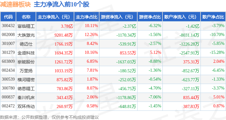 从资金流向上来看,当日减速器板块主力资金净流出7.93亿元,游资资金净流出3201.93万元,散户资金净流入8.25亿元。减速器板块个股资金流向见下表: