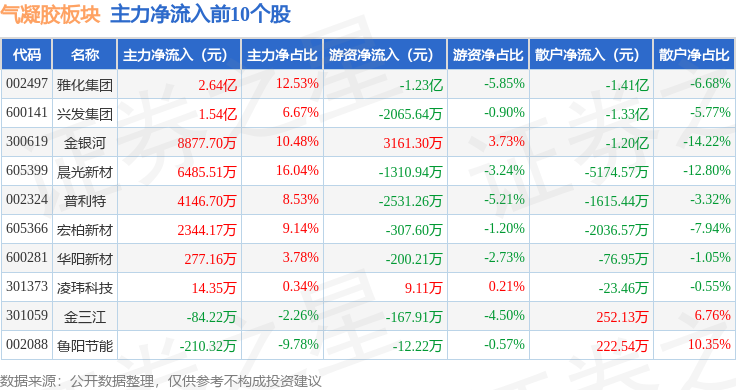 从资金流向上来看,当日气凝胶板块主力资金净流入4.32亿元,游资资金净流出1.43亿元,散户资金净流出2.89亿元。气凝胶板块个股资金流向见下表: